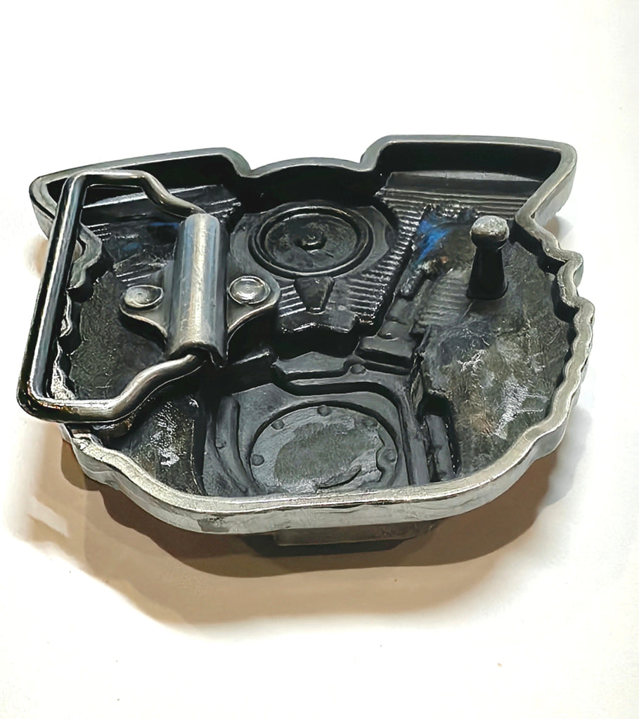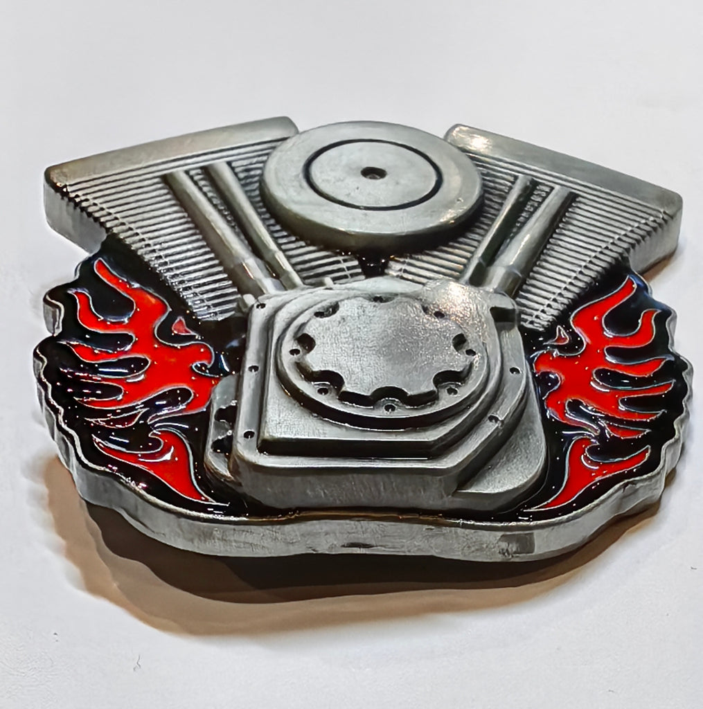 Made from solid Zinc Alloy, this buckle is compact yet heavy, with detailed textures that highlight every fin, bolt, and flame. It’s a tribute to the machine, the spirit, and the legend beneath the leather.